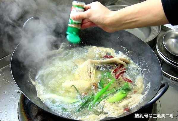 加入料酒10克去腥、鸡精2克、食盐3克、胡椒粉1克。大火把水烧开,打去锅中的浮沫。