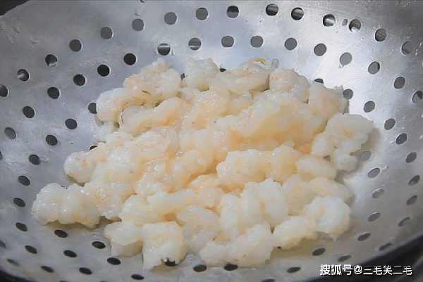 锅内再烧水,把虾仁焯一下水,水快烧开时, 放入虾仁,焯水20秒倒出,用清水快速冲洗干净。控干水分。