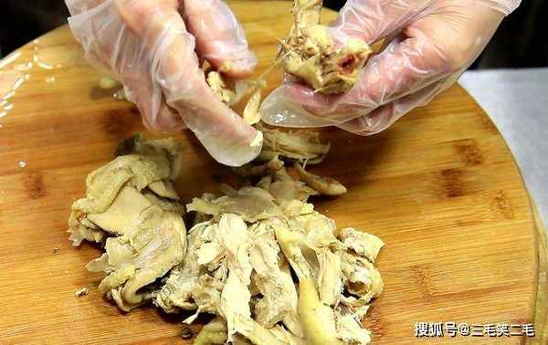 15分钟以后,鸡肉已经非常的软烂,能用筷子轻轻穿透。我们把它取出,放入清水中过凉。这一步是为了收紧鸡皮,达到外脆里嫩的口感。鸡肉晾凉以后取出来,用手撕成均匀的小块,放入盆中备用。