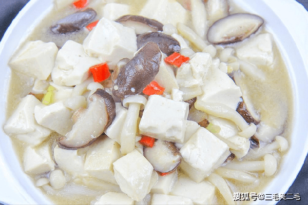 3.锅内烧油,倒入葱、姜一起翻炒,炒出香味以后淋入适量清水,把豆腐和菌菇放进去,加入食盐2克、鸡粉2克、胡椒粉1克推动化开调料。转小火煮2分钟,让菌菇的营养融入汤里,再加入少许水淀粉,让调料更好地吸附在食材表面,翻匀后即可出锅装盘。