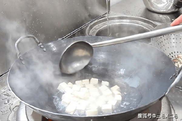 2.锅内烧水,把香菇和白玉菇倒进去,大约煮1分钟,香菇和白玉菇断生以后倒出控水。锅内再烧水,把豆腐倒进去,去除一下豆腥味,大约煮40秒钟,把豆腐倒出来,控水备用。