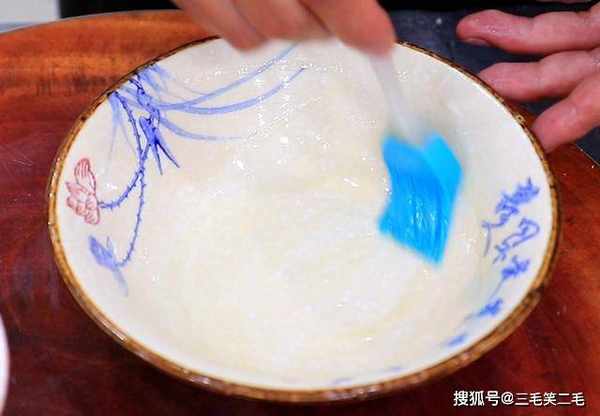 2.再准备一个碗,在四周刷上植物油,把牛奶蛋液倒进去,刷油的目的是为了防止做好的蛋羹粘在碗上。