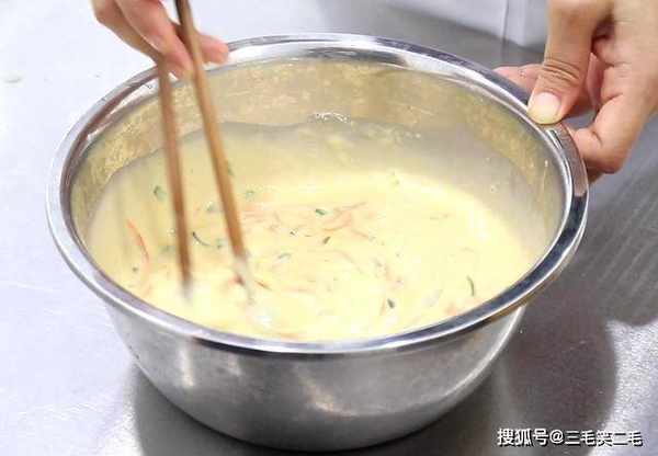 3.10分钟以后把胡萝卜和南瓜丝捞出来攥干水分,放入面糊里面拌匀,菜糊就调好了。