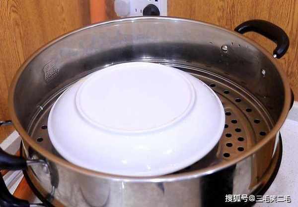3.锅内烧水,水烧开以后把蛋液放在篦子上,在上面盖一个盘子,盖上锅盖蒸12分钟即可。蒸制时要用盘子盖住,隔离水汽,否则蛋羹不够平滑。