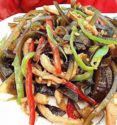 3. 放入海带和青红椒丝炒,大火炒稍收下汁,放入胡椒粉炒匀,最后淋入少许醋出锅。