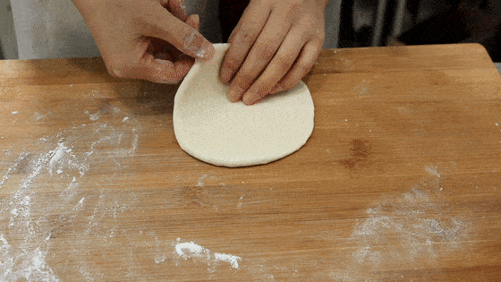 3.把面剂子粘上面粉全部揉成小面团,然后用擀面杖擀成圆饼如图中所示,先对折一次,在对折一次,用刀横着压出花纹,把三角处切开在手指处卷一圈,做成猪蹄的形状。