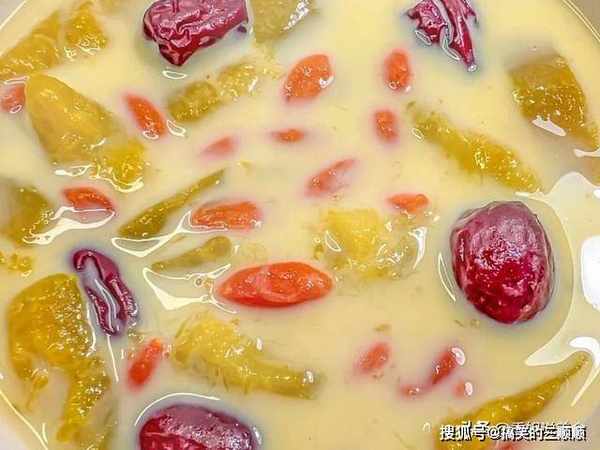 2、接着再放入冰糖和枸杞,继续煮3分钟左右。然后放入牛奶煮开即可。清甜好喝,细腻又顺滑,冬天多喝,可以滋润养颜又暖身。