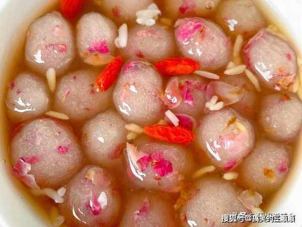 木薯粉100克,开水85克,红糖,玫瑰花瓣,酒酿,枸杞。