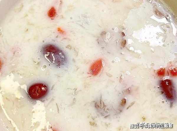 3、接着放入红枣和冰糖,继续小火煮10分钟,再加入枸杞煮2分钟。时间到,关火倒入牛奶搅拌均匀即可。