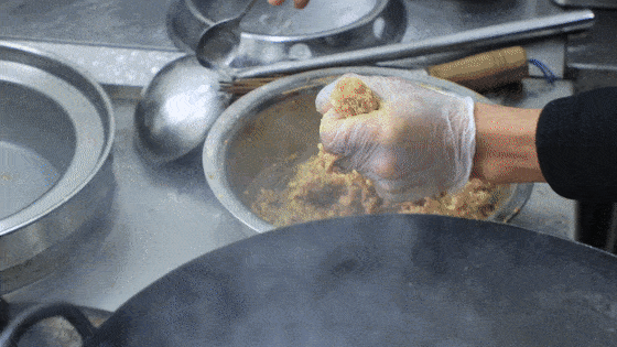 7.在丸子没有定型之前,不要直接推动丸子,可以用勺子轻推一下锅边的油,丸子慢慢定型,等丸子表皮凝固,有粘连在一起的,用勺子轻轻打散,丸子颜色变成金黄色捞出控油。