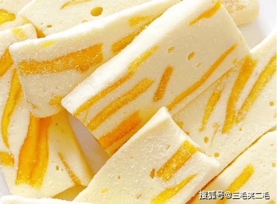 新鲜的芒果制成水果干后,与黄油和奶粉混合,再加入适量的木糖醇增加甜味。芒果干镶嵌在乳黄色的奶糕中,小清新的配色让人充满食欲。
