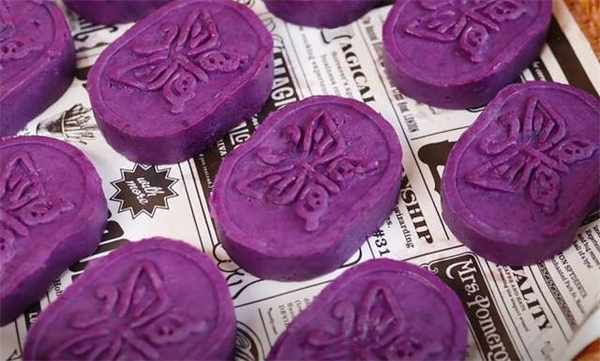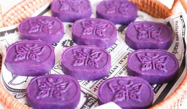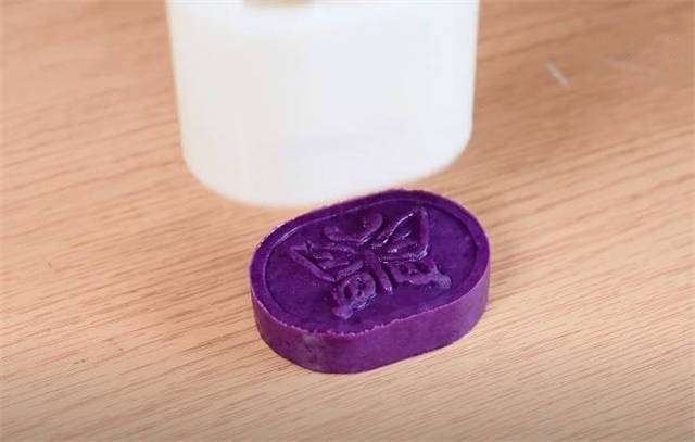 6.拿一个模具出来按压成好看的花纹,我们的紫薯糕就做好了。