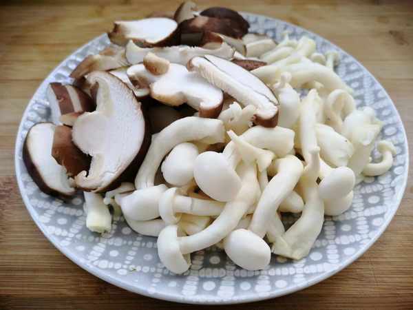 2、白玉菇切掉根部的一小部分,用水清洗一下,香菇也清洗干净,切成片,装入盘中待用。