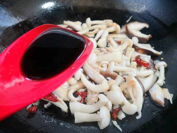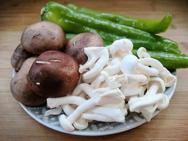 食材:青椒、白玉菇、香菇、蒜末、干辣椒、盐、生抽、胡椒粉。