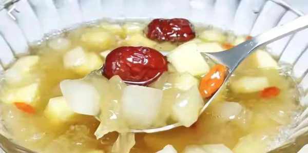 2、锅中放入雪梨,萝卜和银耳,加适量的水,盖上盖子,大火烧饭后转小火煮至20分钟,时间差不多了,放入一些冰糖。再煮三分钟可以了,放入枸杞煮三分钟就可以了。