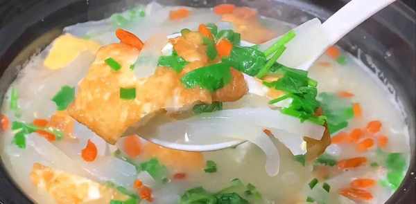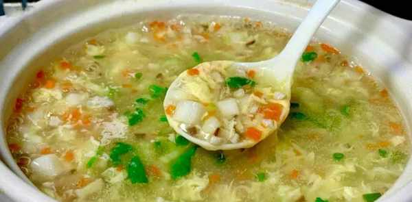 3、将鸡蛋液慢慢的放进来,搅拌均匀就差不多了。再把葱花和香菜加进来,搅拌均匀,山药汤就这样做好了。