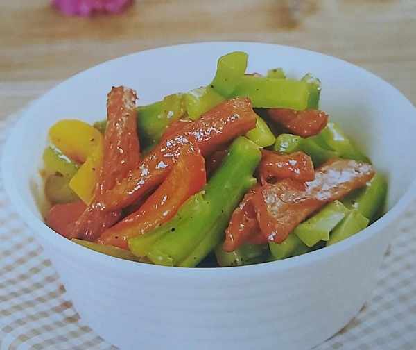 4把切好的美人椒、杭椒和香芹过油,备用。
