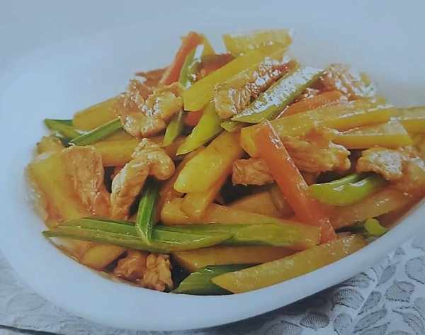 7放入胡萝卜、土豆、芹菜煸炒,放入盐、鸡精调味,煸炒成熟,装盘即可上桌。