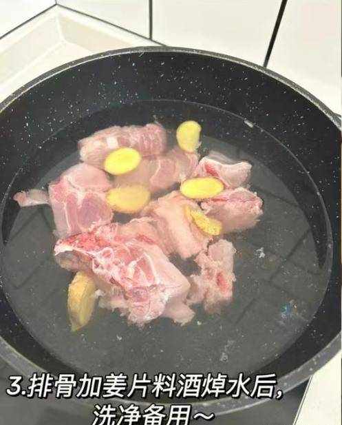 步骤4:排骨全部砍成块,另外起锅放入排骨块,加上适量冷水没过排骨,加上若干片老姜,加上黄酒或料酒,将排骨焯水处理,中途舀掉一层浮沫,捞出用温水冲洗几遍。