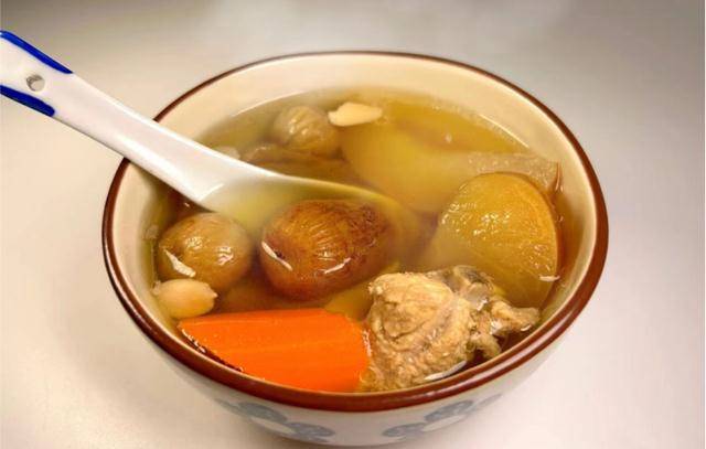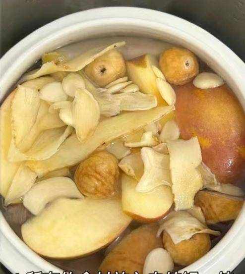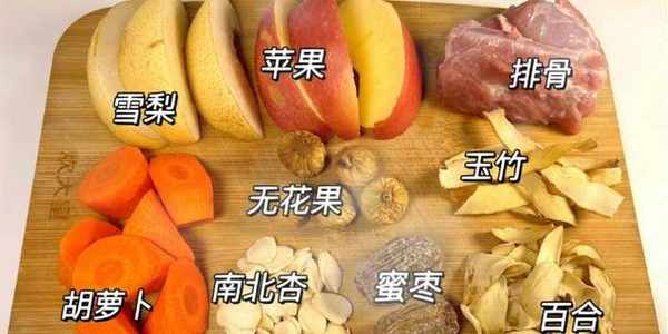 准备一些食材:选购半个雪梨,一个红彤彤的苹果,选购400克优质肋排骨(或者羊肉或脊骨,排骨是南方人煲汤的不错选择,汤汁十分好喝),干无花果几个,玉米15克左右,少许冷水,干百合15克左右,胡萝卜一根半,南北杏少许,蜜枣几个,少许温水,食盐少许,一小勺胡椒粉,适量料酒,姜片若干片,几根香葱,其他佐料。
