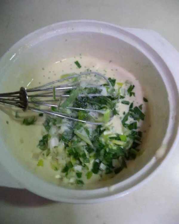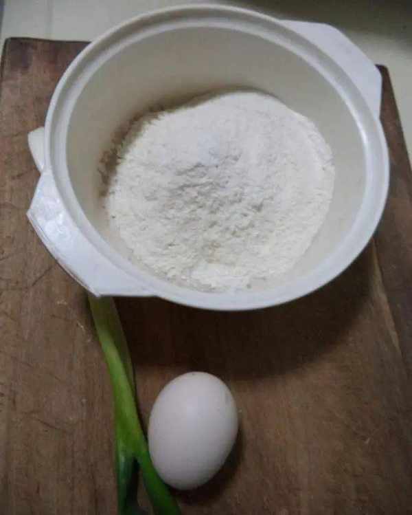 所需要的食材:高筋面粉50克、鸡蛋1个、大葱1根、水60毫升、盐和鸡精适量