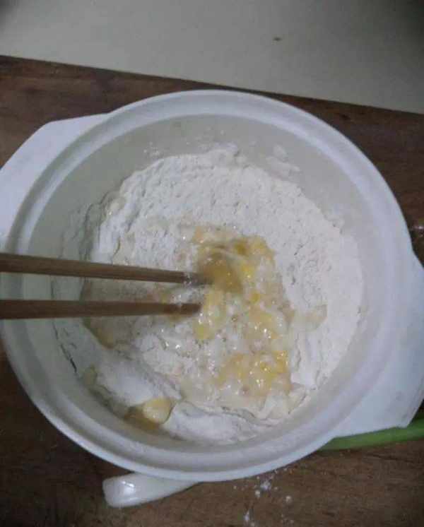 1、先把鸡蛋打入面粉碗中搅拌均匀,然后再加入适量的清水。水的比例也很重要,最好是面粉和水1:1的量就可以或者1:1.5也可以,这两种口感都很好。