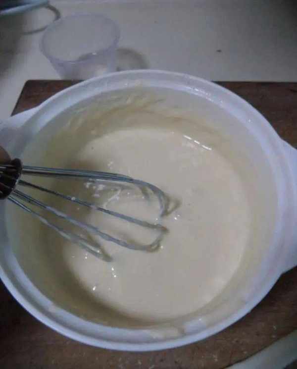 2、用搅拌器把面糊搅拌均匀,让面糊变得丝滑细腻。面粉加入鸡蛋和清水后要顺时针搅打上劲,不要来回的搅打,直到面糊变得细滑无颗粒,提起后面糊可以缓缓的丝般滑落就可以了,这步很重要,是面饼口感香软筋道的窍门。