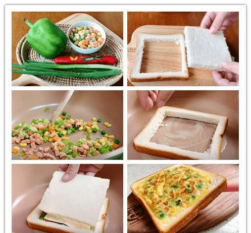 5、不粘锅里刷一点油,先把吐司的边缘放到锅里,再加入混合的鸡蛋蔬菜液(全程小火)再放一片芝士片,再把刚刚掏掉的那块儿吐司盖上去,翻面继续煎至熟即可,