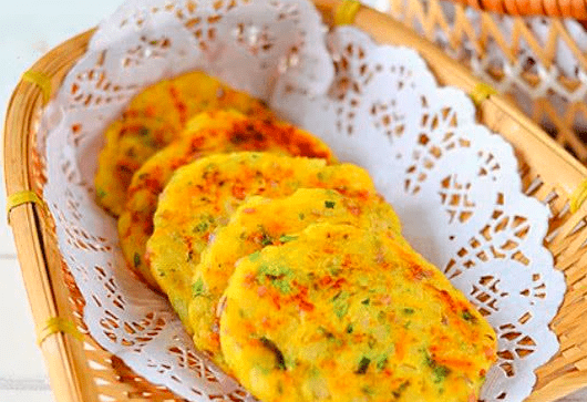 拌均匀,用手搓成圆球后压扁,锅里烧油放入土豆饼