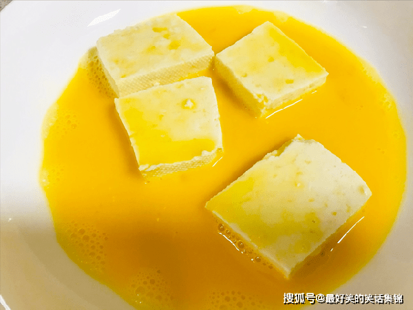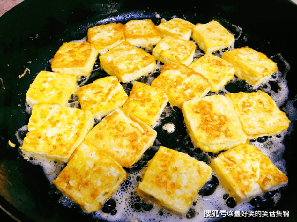 3、起锅烧油,油稍微多一点,开中小火加热,依次下入豆腐块,每隔一分钟翻一次面,煎至色泽金黄,即可出锅。