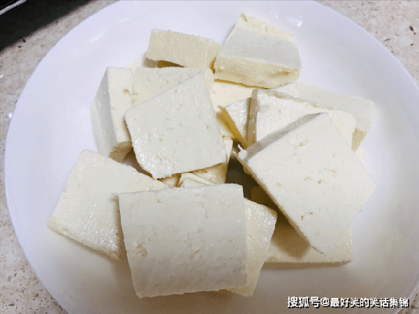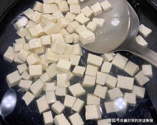 1、准备一块南豆腐,南豆腐一般都是包装好的,不像北豆腐那样,可以在菜市场散卖,回到家先切成四方丁,起锅烧水,加半勺食盐,焯烫2分钟,控干水分,这样能去掉一部分豆腥味。