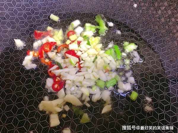 4、另外准备一个锅,倒入植物油,油热下葱姜蒜末,为了美观,也可以少量来点彩椒,爱吃辣的放两个小米椒,爆出葱香味。