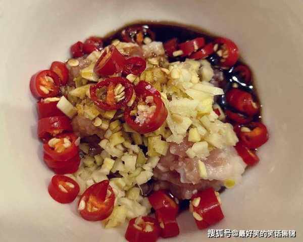 2、准备用到的食材,适量的小米椒,葱姜末,肉末,生抽,食盐,再来上点肉末,翻拌均匀,腌制一会儿。