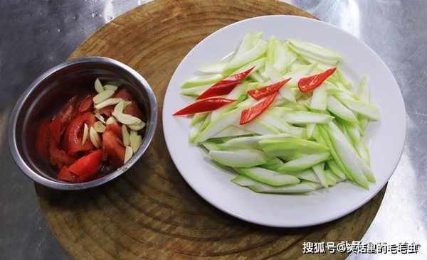锅内烧油,油热以后放入几粒干辣椒爆出香味,倒入切好的番茄和蒜片,快速翻炒出番茄的红汁,在倒入瓠子翻炒均匀,淋入5克白醋突出酸爽的口感。