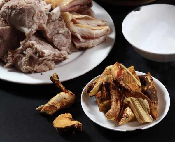 原料:鸡1只、猪瘦肉200克、五指毛桃50克、生姜3片;红枣、枸杞、蜜枣一个适量。
