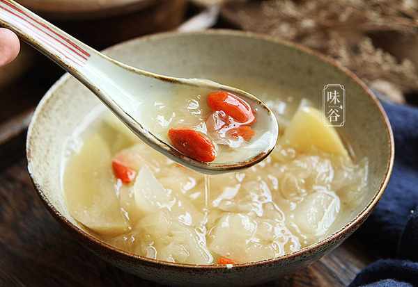 【食材】:雪梨 1个、苹果 1个、枸杞 少许、银耳 1朵(大的话就减点)、冰糖 适量