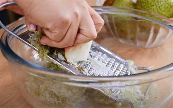 2.梨子洗净后不用削皮,直接擦成细丝。