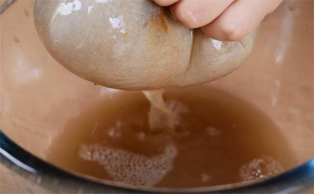 7.这时候再准备一块纱布,把梨汁过滤出来。8.倒完梨汁之后开大火煮开,一直煮到这样沸腾的状态,我们转小火慢慢熬。
