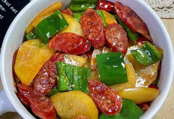 做法:土豆、腊肠切片、青椒切小块,锅中水开,放入土豆煮2分钟捞出备用