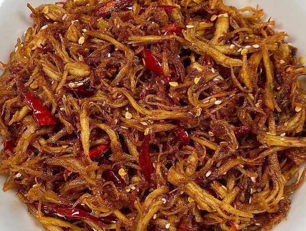 做法:鸡胸肉洗净冷水下锅加葱姜、料酒焯水捞出;撕成丝+2勺生抽、1勺蚝油、1勺十三香抓匀,油热下鸡丝翻炒至收干水分,炒至焦黄色