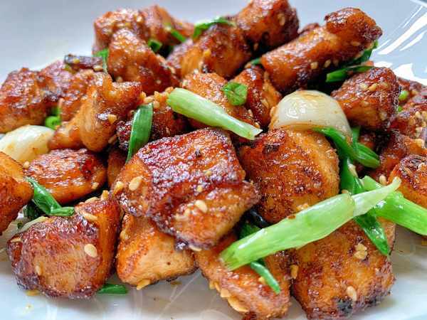 步骤:鸡胸肉切丁,用调味料腌制30分钟;葱切小段(与鸡丁大小匹配)、姜蒜切块备用;起锅烧油,慢火煸鸡丁 至金黄;加入姜蒜块继续焖煸;倒点老抽再调调色,继续炒;撒空气炸锅孜然粉,加入葱段煸炒出锅