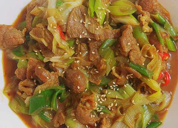 牛肉片加料酒+生抽+老抽+蚝油+胡椒粉+孜然粉+淀粉,搅拌均匀腌制;斜切大葱洗净备用、小米辣切碎备用;热油锅下小米辣爆香,放入牛肉片翻炒至五分熟,放入大葱段再一起翻炒至熟即可,最后根据个人口味加调料葱花芝麻等。