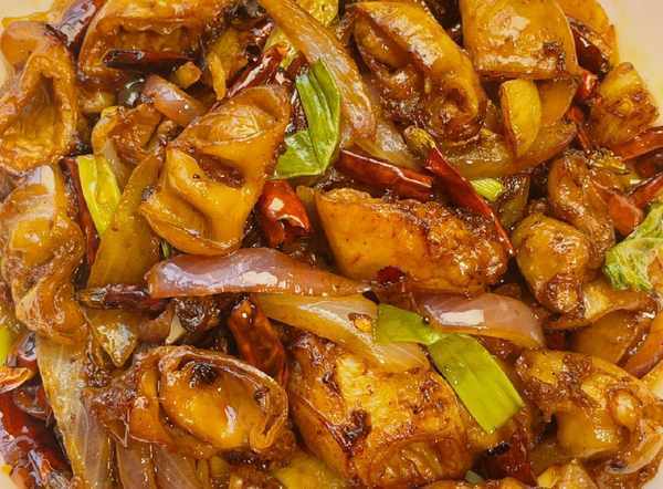 食材:肥肠 干辣椒 洋葱 蒜