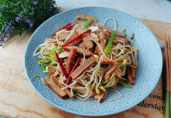 【黄豆芽炒香干】所需材料:黄豆芽半斤、香干2片、尖椒2个、油盐适量、葱1段、姜2片、大蒜2瓣、干辣椒4-5个、生抽1汤匙、