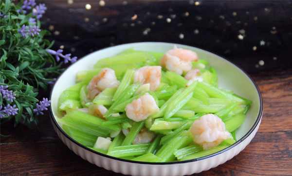 6.下入芹菜一起大火翻炒均匀,再加入盐,鸡精翻炒均匀,淋入适量的水淀粉勾薄芡,快速翻炒几下,盛出装盘即可。一盘清淡可口的芹菜炒虾仁就做好了。