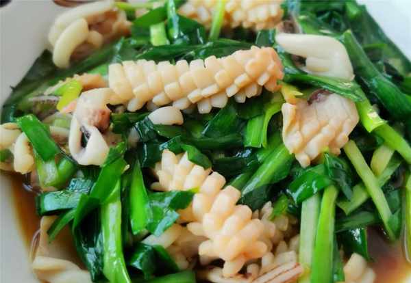【鱿鱼炒韭菜】所需材料:鱿鱼2条、韭菜250克、油盐适量、姜1块、大蒜2瓣、料酒1汤匙、