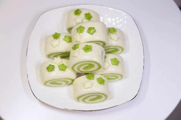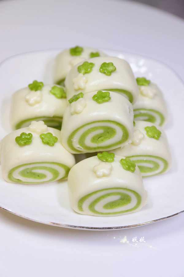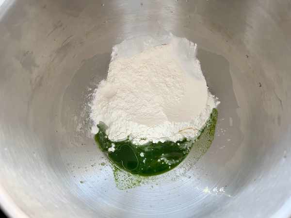 1,菠菜叶子煮熟,加少许清水打成菠菜汁,加入一勺油,白砂糖,酵母粉,面粉,和成绿色的菠菜面团。
