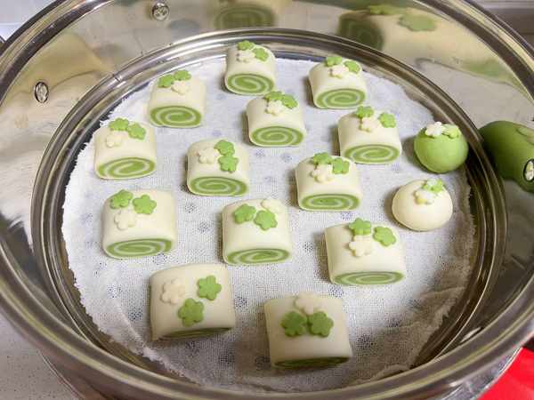 6,把提前预留的面团压扁,压出一些造型,用水沾湿后贴在馒头上,造型可随意发挥,我用的是小花朵。