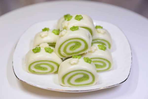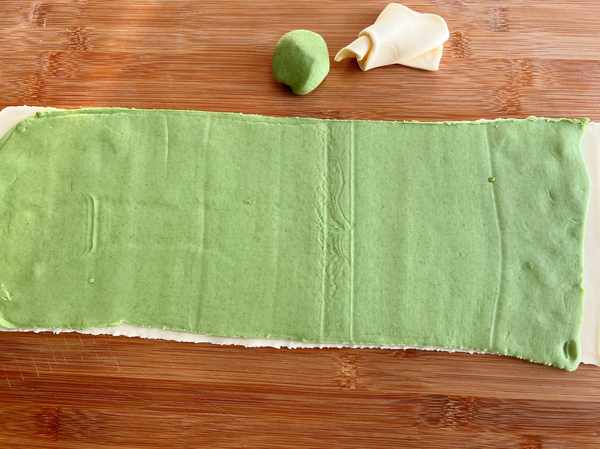 4,把两种颜色的面团叠在一起,从上往下卷起来,卷的时候稍微滚紧一些。