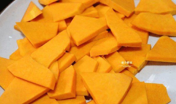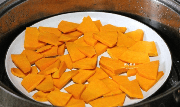 2、在煮燕麦片的同时,我们可以把南瓜蒸一下。